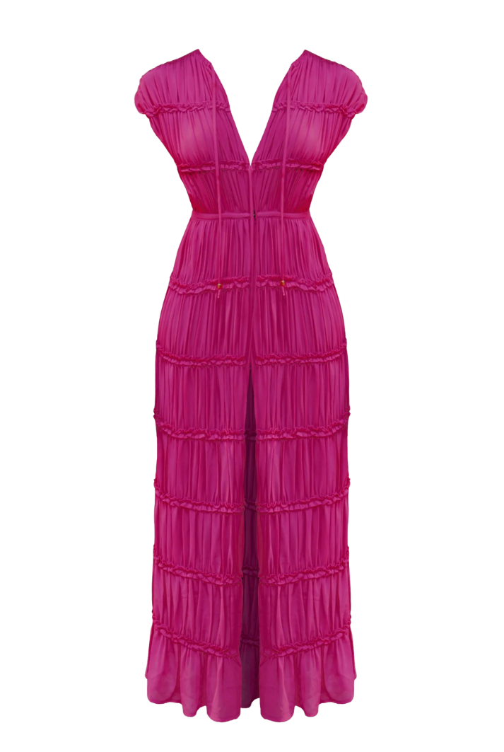 Regular price $290.00The SINA Tunic in Magenta is a lightweight chiffon tunic designed for effortless warm weather dressing. Flowing to an ankle grazing length, this sheer tunic dress features softly ruched horizontal panels that add texture and movement to its fluid silhouette.