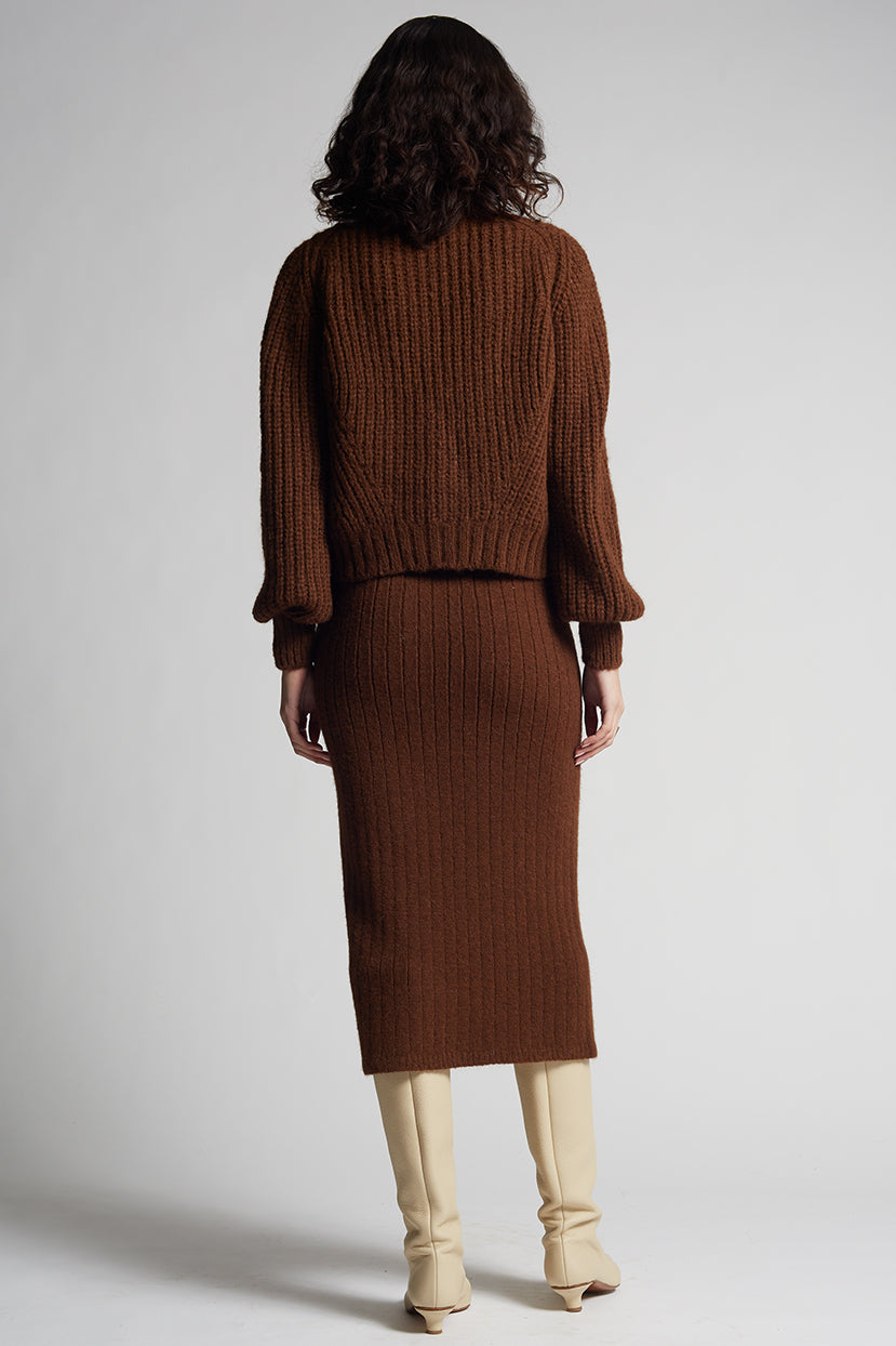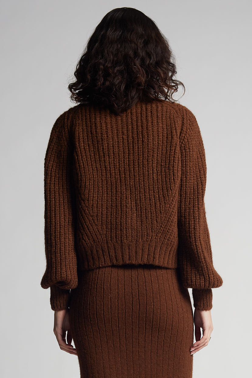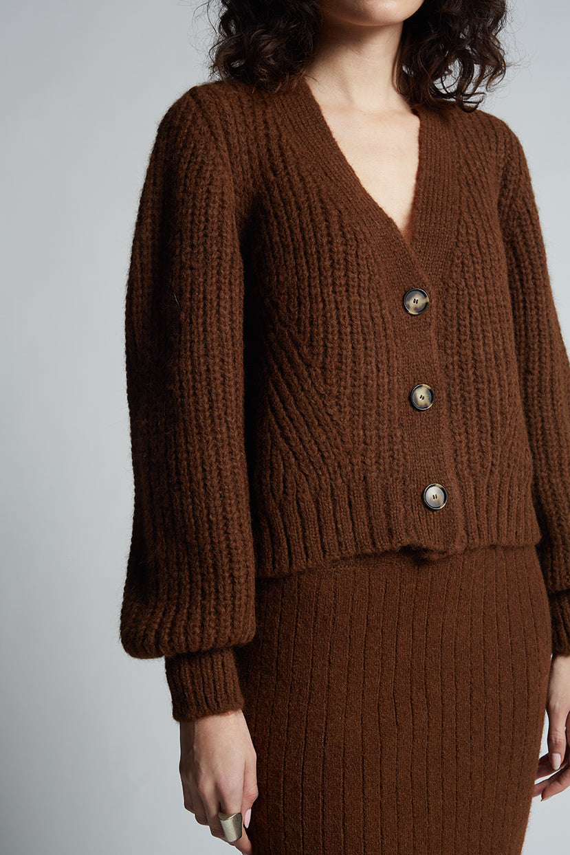 This brown alpaca cardigan combines soft texture and refined design in a timeless silhouette. Crafted from luxurious alpaca yarn, it features feminine blouson sleeves, a slightly cropped shape, and three statement buttons for a polished finish.